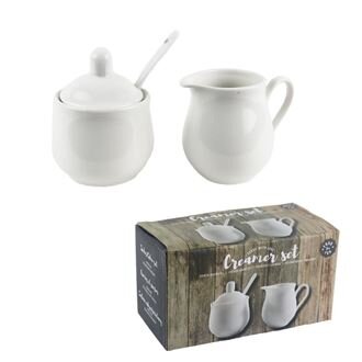Cukřenka + mlékovka.Cukřenka má rozměry : průměr 6,5 cm, výška 9 cm.Mlékovka má rozměry : průměr 5,5 cm, šířka 9 cm, výška 7,5 cm.Barva : bílá.Materiál : porcelán.