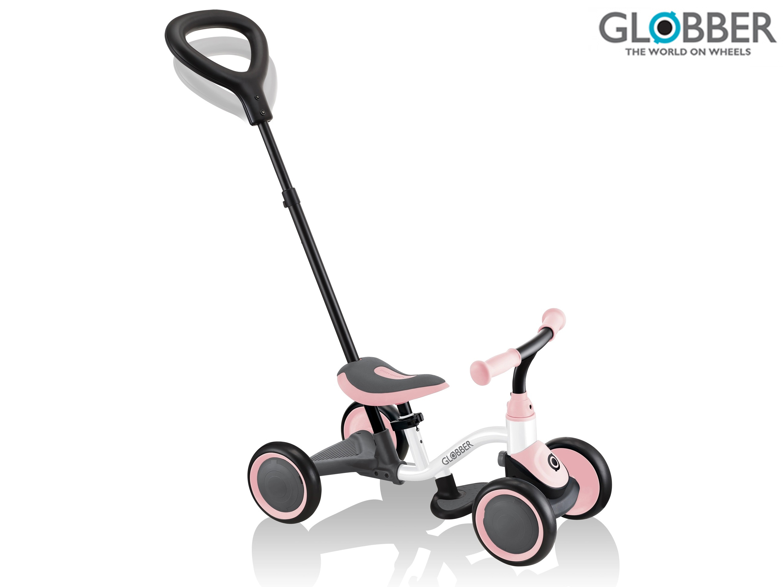 tiché gumové kolečka, nastavitelná výška vodící ručky, patentovaný systém otáčení koleček, 3v1 - odrážedlo pro vezení dítěte s rodičovskou rukojetí, učební odrážedlo se čtyřmi koly a klasické 3kolové odrážedlo