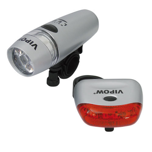 Sada cyklo osvětlení: 1x přední světlo, 1x zadní světlo, 2x držák. Přední světlo: