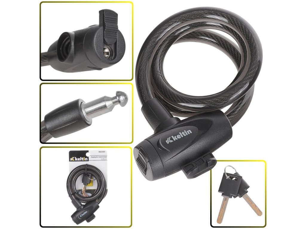 Zámek na kolo se spirálovým ocelovým lanem opatřeným plastovým ochranným potahem a zamykáním na klíč. Spolehlivé zabezpečení pro kolo při vyjížďkách, nákupech nebo jako další zabezpečení ve sklepě, garáži, kolovně.