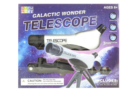 Plastový teleskop se stojanem. Průměr objektivu 60 mm, zaostřovací vzdálenost 170 mm, zvětšení 20x, 30x a 40x. Rozměry balení cca 30,5 x 25 x 6 cm. Věk 8+ číst celé