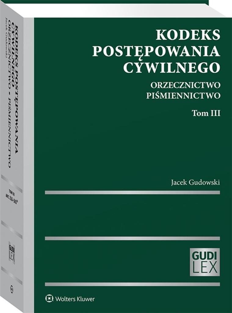 Tom III zawiera orzecznictwo Sądu Najwyższego z lat 19182020 oraz piśmiennictwo z lat 18302020, dotyczące art. 316505[39] Kodeksu postępowania cywilnego lub zachowujące ścisły związek z jego przepisami. Na publikację składa się część bogatych zbiorów bibliograficznych autora, obejmujących prawie 100 000 pozycji. Liczy ona ok. 15 000 orzeczeń przypisanych do poszczególnych artykułów Kodeksu oraz tyleż pozycji piśmiennictwa. W zbiorze umieszczono wszystkie orzeczenia opublikowane ze wskazaniem opracowanych do nich glos, notek, omówień lub komentarzy niepublikowane natomiast tylko te, które autor uznał za ważne, istotne lub z innych powodów warte upowszechnienia. Czytelnik zmagający się z jakimś problemem prawnym lub odczuwający niedostatek wiedzy może sięgnąć do wykazów orzecznictwa i piśmiennictwa umieszczonych pod określonym artykułem Kodeksu postępowania cywilnego znajdzie tam z łatwością wszystkie orzeczenia dotyczące tego artykułu lub kwestii prawnej w tym artykule unormowanej. Znaczenie poszczególnych orzeczeń zostało zaznaczone przez autora stosownymi piktogramami. Dzieło będące owocem ponad 40-letniej bibliograficznej działalności autora zostało sporządzone z nadzwyczajną, niespotykaną już dzisiaj skrupulatnością i rzetelnością. Stanowi kontynuację cyklu GUDI-LEX, rozpoczętego w 2018 r. zbiorem orzecznictwa i piśmiennictwa do Kodeksu cywilnego (4 tomy, 5 woluminów). Jest także zapowiedzią wydania podobnej publikacji dotyczącej Kodeksu rodzinnego i opiekuńczego.
