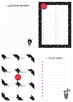 4 Blöcke im Set in schwarz-weiß, inkl. Einkaufsliste, Notizblock, ToDo-Liste und Wochenplaner. (německy)