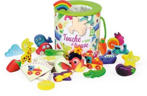Úžasná hra Hmatej a najdi od firmy Vilac. Tato hra je založena na principu hmatového vnímání, kdy má hráč za úkol jen na základě hmatu poznat, který konkrétní předmět zrovna drží v ruce a přiřadit ho k správnému obrázku. Jedná se o hračku vyrobenou ze dřeva, takže rozhodně něco vydrží. .. cena je poměrně vyšší, na podobném principu je založen i zajíc v pytli od Granny nebo si můžete hmatovou pomůcku snadno vyrobit z krabice.