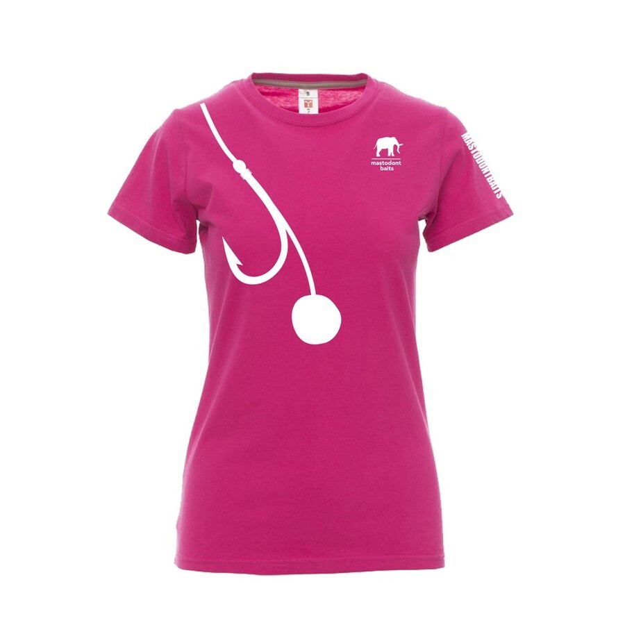 Dámské tričko pro rybáře v fuchsiové barvě s krátkým rukávem a kulatým výstřihem, 1,5 cm pružný žebrovaný lem ze směsi spandex u krku s vrchním prošíváním na přední straně, barevně kontrastní výztuž od ramene k rameni viditelná na límečku, pružné švy, tubulární střih.