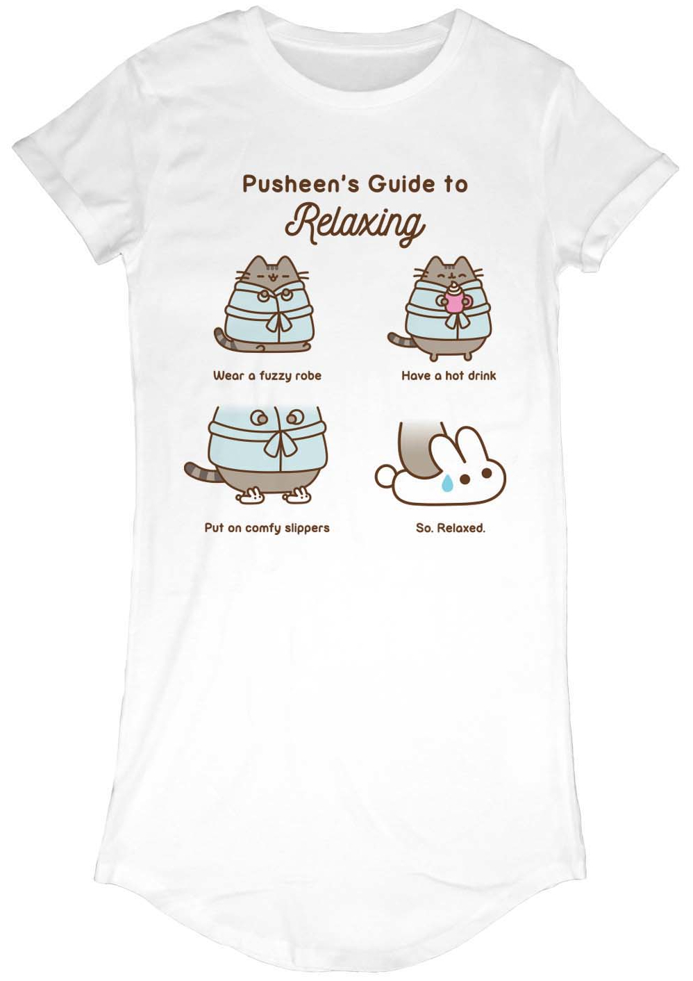 Bílé dámské tričko inspirované grafikou kočky jménem Pusheen a nápisem Pusheen\'s Guide to Relaxing.