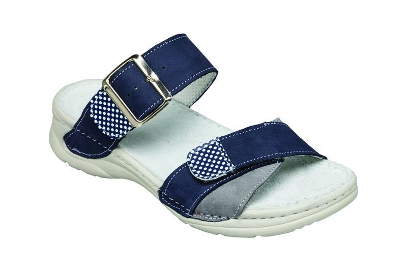 Zdravotní obuv - dámský pantofel.Svrchní materiál - useň.Nastavitelné pásky - horní na přezku a dolní na suchý zip.Stélka - anatomicky tvarovaná z usně.Barva - modrá.