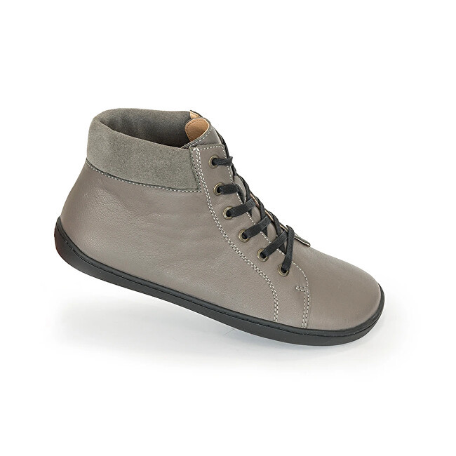 Dámská barefootová vycházková obuv Margit grey má gumovou, měkkou a ohebnou podrážku. Bota je kolem kotníku polstrovaná s mírně zpevněnou patou. Obuv je celoroční a vyrobena z hladké kůže.