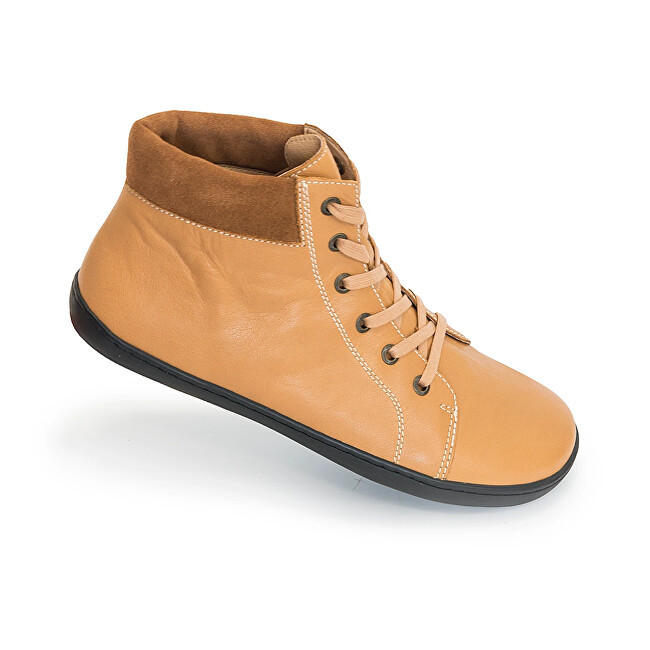 Dámská barefootová vycházková obuv Margit camel má gumovou, měkkou a ohebnou podrážku. Bota je kolem kotníku polstrovaná s mírně zpevněnou patou. Obuv je celoroční a vyrobena z hladké kůže.