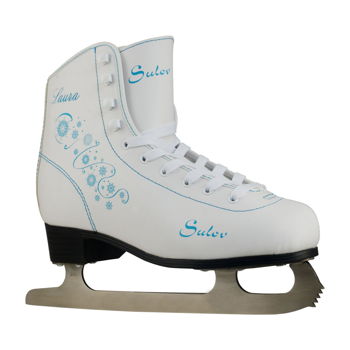 Dámská zimní brusle s jemným potiskem. Bota s klasickým šněrováním je vyrobená ze syntetické kůže. Nerezový nůž.