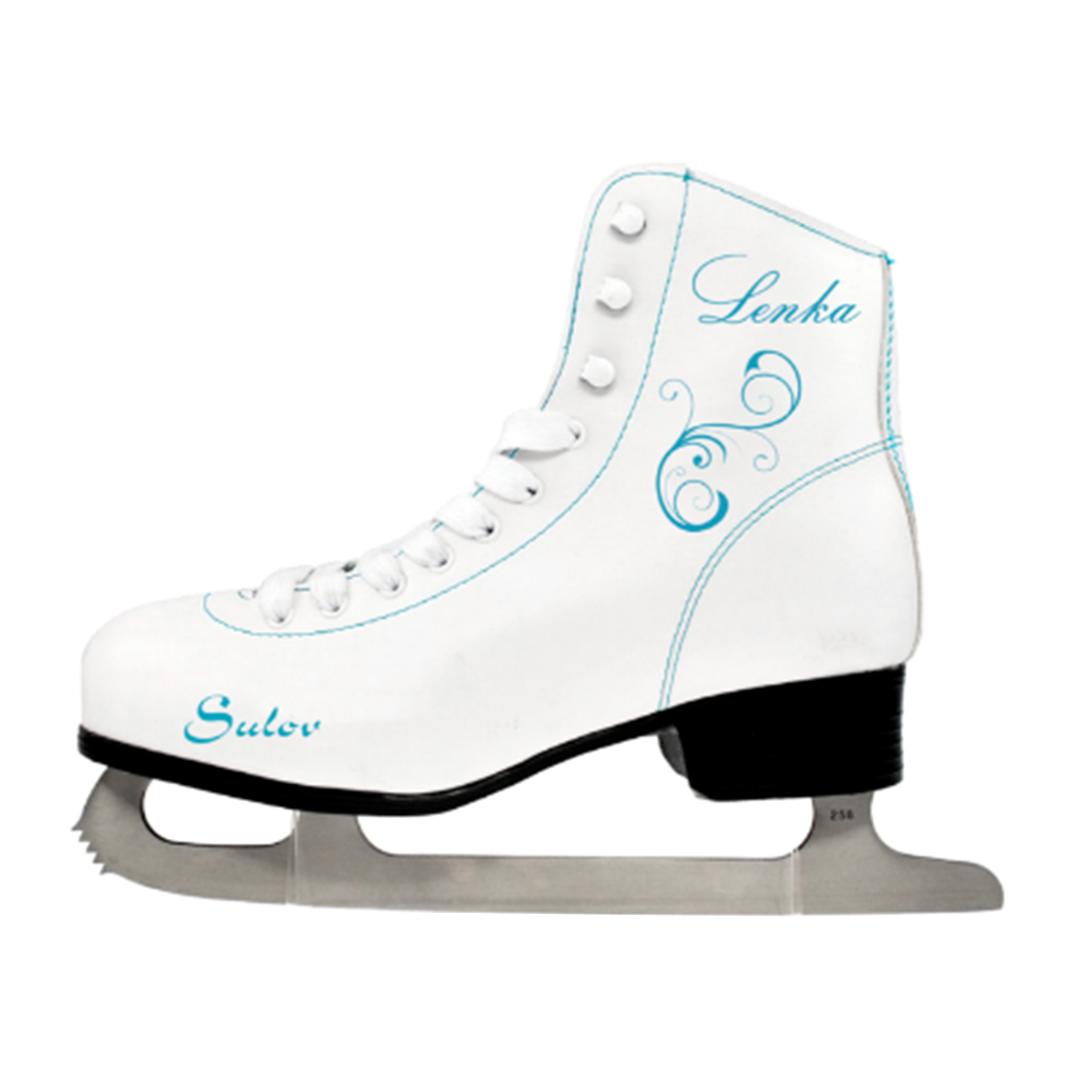 Dámská zimní brusle s jemným potiskem. Bota s klasickým šněrováním je vyrobená ze syntetické kůže. Nerezový nůž.