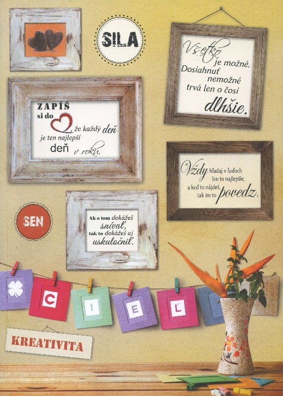 Tento zošit je tu na to, aby vás povzbudil a priniesol veľa skvelých nápadov. Vaše myšlienky sú hodnotné a preto sme dbali na kvalitu. Vnútorné strany sú z nadštandardného hrubého 90 g papiera veľmi príjemného a dotyk. Aby vás inšpirovala nielen predná strana, ale aj celý zošit, dali sme doň dva citáty, ktoré sa na každej druhej strane striedajú. Predná aj zadná strana má klopy, ktoré môžete použiť ako motivačné záložky a budete tak vždy vedieť, na ktorej strane ste skončili, alebo ktorá strana je dôležitá. Využite ho na písanie poznámok v škole, zapisovanie myšlienok na seminároch a kurzoch, v práci alebo na uchovanie vašich hodnotných nápadov. Citáty na vnútorných stranách: “Ak o tom dokážeš snívať, tak to dokážeš aj uskutočniť.” - Walt Disney “Nič veľké nebolo nikdy dosiahnuté bez nadšenia.” - R. W. Emerson