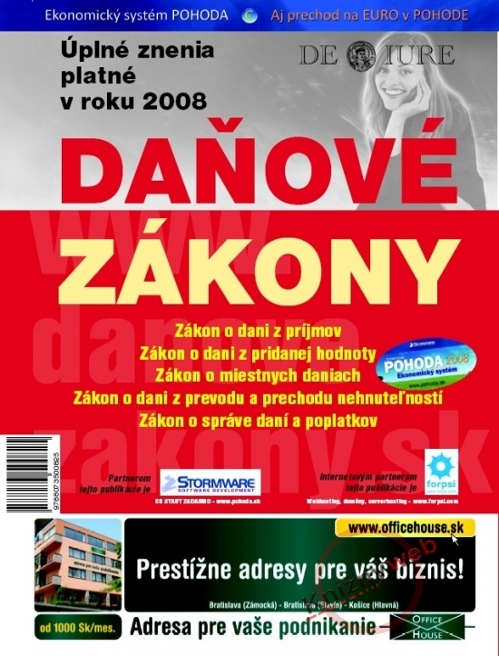 Publikácia zhrňujúca aktuálne platné znenia slovenských daňových zákonov pre rok 2008 s grafickým zvýraznením zmien a s bezplatnou internetovou podporou. Prehľadná úprava.