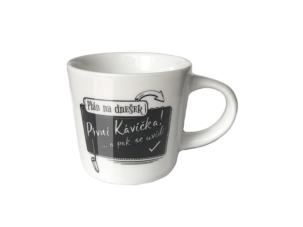 Mini hrneček "Plán na dnešek. První kávička a pak se uvidí." pro velké milovníky malé kávy.