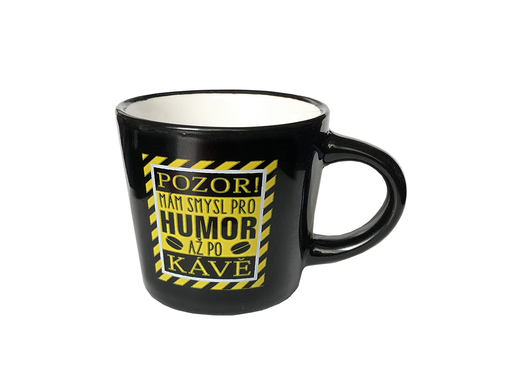 Mini hrneček "Pozor! Mám smysl pro humor až po kávě." pro velké milovníky malé kávy.