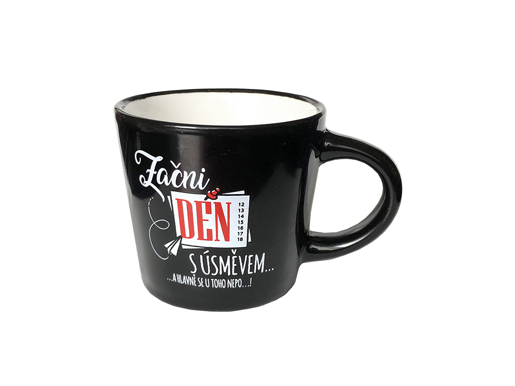 Mini hrneček "Začni den s úsměvem… a hlavně se u toho nepo…!" pro velké milovníky malé kávy.