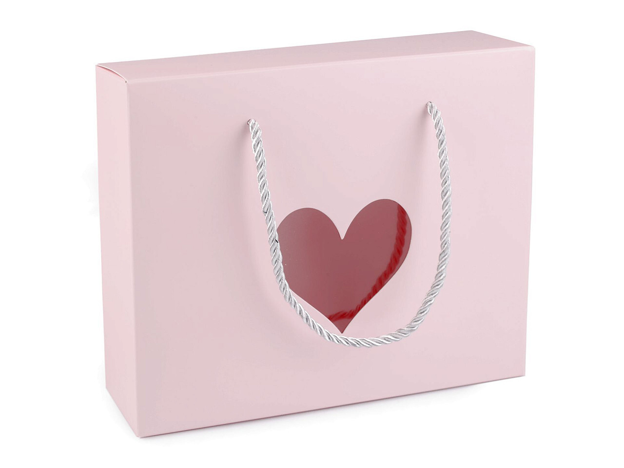Papírová krabice s průhledem srdce má ucha z lesklé kroucené šňůry. Slouží jako taška s uzavíráním, bez uch ji můžete použít jako klasickou dárkovou krabici. Výřez srdce je zespodu podlepený průhlednou fólií. Krabici využijete na balení dárků, šátků, kosmetiky apod.