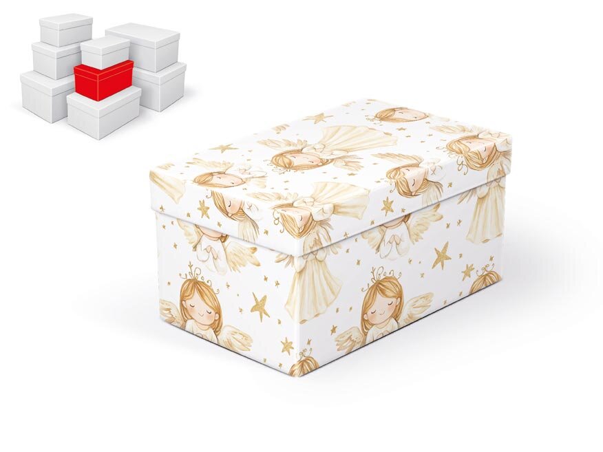 Vánoční dárková krabička vyniká jemným motivem andílků a zlatých hvězdiček, který jí dodává jedinečný šarm. Díky svému vzhledu se stává ozdobou sama o sobě a vaše dárky v ní získají pečlivě upravený a jednotný styl. Praktické provedení navíc zajistí, že zabalení je rychlé a bez starostí.