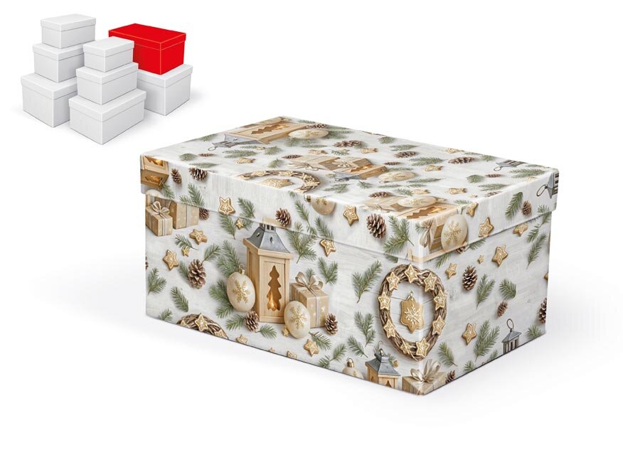 Vánoční dárková krabice o rozměrech 26 x 17 x 13 cmKdyž chcete darovat něco většího, přijde vhod prostornější krabička, která nabídne dostatek místa například pro kosmetické sady, knihy, svíčky nebo více menších drobností. Vánoční design s přírodními dekoracemi, šiškami a zlatými ozdobami z ní...
