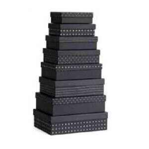 Sada dárkových krabic.Rozměry: 14,5 x 10 x 5 cm; 17 x 12 x 5,5 cm; 9 x 13,5 x 6 cm; 22 x 16 x 6,5 cm; 24,5 x 17,5 x 7 cm; 27,5 x 19,5 x 7,5 cm; 29 x 21 x 8 cm; 33 x 23.5 x 9 cm; 35 x 25 x 10 cm; 37 x 27 x 13 cm číst celé