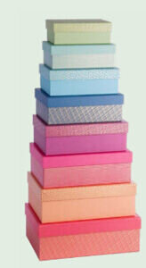 Sada dárkových krabic.Rozměry: 14,5 x 10 x 5 cm; 17 x 12 x 5,5 cm; 9 x 13,5 x 6 cm; 22 x 16 x 6,5 cm; 24,5 x 17,5 x 7 cm; 27,5 x 19,5 x 7,5 cm; 29 x 21 x 8 cm; 33 x 23.5 x 9 cm; 35 x 25 x 10 cm; 37 x 27 x 13 cm