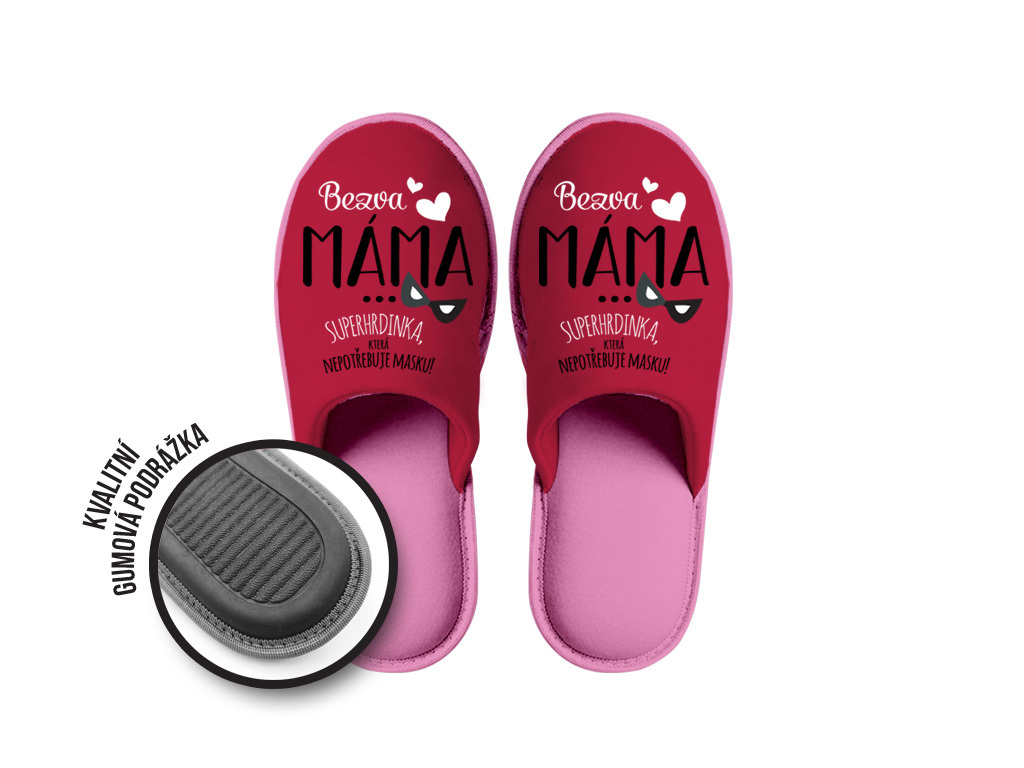 Dárkové papuče s vtipným textem "Bezva máma... superhrdinka, která nepotřebuje masku!".