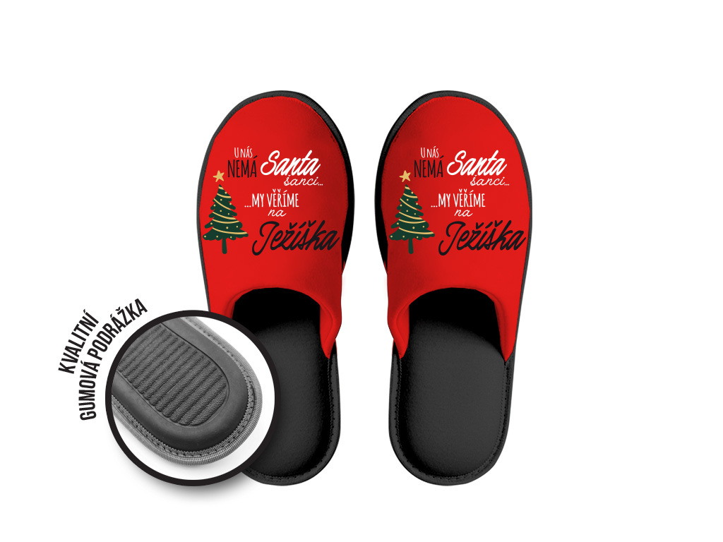 Dárkové papuče s vtipným textem "U nás nemá Santa šanci... my věříme na Ježíška".
