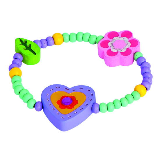 Barevný náramek z dřevěných korálků se pyšní velkým fialovým srdíčkem s kytičkou, zeleným lístečkem a růžovým kvítkem. Padne na každou ručičku a je něžnou ozdobou malé slečny.