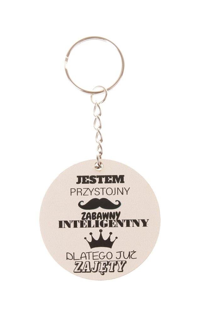 Breloczek z zabawną grafiką to nie tylko ciekawy pomysł na upominek, ale niezwykle funkcjonalny element, który można przyczepić do kluczy czy szkolnego plecaka. Drobny, miły prezent dla młodego mężczyzny nie tylko na Dzień Chłopaka, bowiem napis Jestem przystojny, zabawny, inteligentny, dlatego już zajęty czyni ten upominek uniwersalnym na różne okazje. Wykonany został z płyty MDF i ozdobiony jest piękną, kolorową grafiką, która nadaje mu wyjątkowego uroku. Nadruk jest wysokiej jakości, co czyni go trwałym w użytkowaniu. Wymiary całkowite ok. 10cm x 5cm. Brelok zapakowany w woreczek z eurozawieszką wraz z kodem EAN.