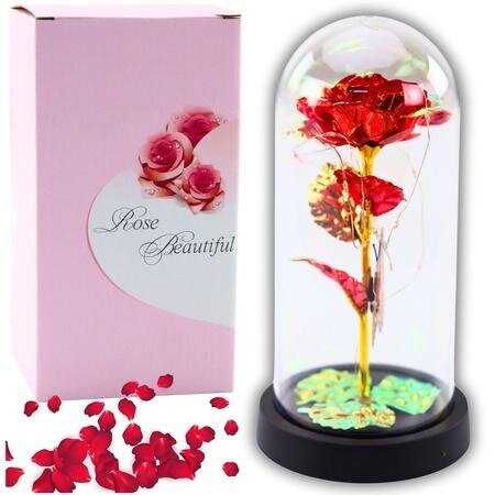 Wieczna Róża w Kopule z Oświetleniem LED i Motylkiem - Czerwona Wieczna róża w szklanej kopule z oświetleniem LED to elegancki i symboliczny prezent, który wyrazi Twoje uczucia i doda wyjątkowego charakteru każdemu wnętrzu. Jej zmieniające się kolory pod wpływem subtelnego światła LED tworzą niepowtarzalną atmosferę, idealną na romantyczne okazje. KLUCZOWE CECHY PRODUKTU Wieczna róża Symbol miłości i uczucia, który nigdy nie przemija. Róża zachowuje swoje piękno na zawsze, nie wymagając żadnej pielęgnacji. Oświetlenie LED Delikatne światło LED podkreśla piękno róży i tworzy ciepły nastrój, idealny do dekoracji wnętrz i romantycznych chwil. Szklana kopuła Elegancka osłona, która chroni różę i pozwala cieszyć się jej urokiem z każdej strony. Plastikowa podstawka Solidna i stabilna podstawka, zapewniająca bezpieczeństwo i estetykę prezentu. SPECYFIKACJA Wymiary kopuły: 11 cm x 21 cm Źródło zasilania: 3 x AAA (baterie nie są dołączone) Materiał róży: Wysokiej jakości tworzywo sztuczne Podstawka: Plastik Oświetlenie: 20 diod LED o ciepłym białym świetle Opakowanie: Prezentowe pudełko Wymiary opakowania: 22 cm x 12 cm x 12 cm Kolor róży: Czerwony ZAWARTOŚĆ ZESTAWU Wieczna czerwona róża w szklanej kopule Lampki LED Plastikowa podstawka Prezentowe pudełko DODATKOWE ATUTY Unikalny design - Perfekcyjnie odwzorowana róża z naturalnym wyglądem, idealna do dekoracji wnętrz. Symbolika - Wieczna róża symbolizuje trwałe uczucie i miłość, czyniąc ją idealnym prezentem na każdą okazję. Łatwość obsługi - Proste włączanie i wyłączanie światełek LED, zapewniające wygodę użytkowania. Ekskluzywna jakość - Dopracowane detale i staranne wykonanie sprawiają, że róża prezentuje się luksusowo.