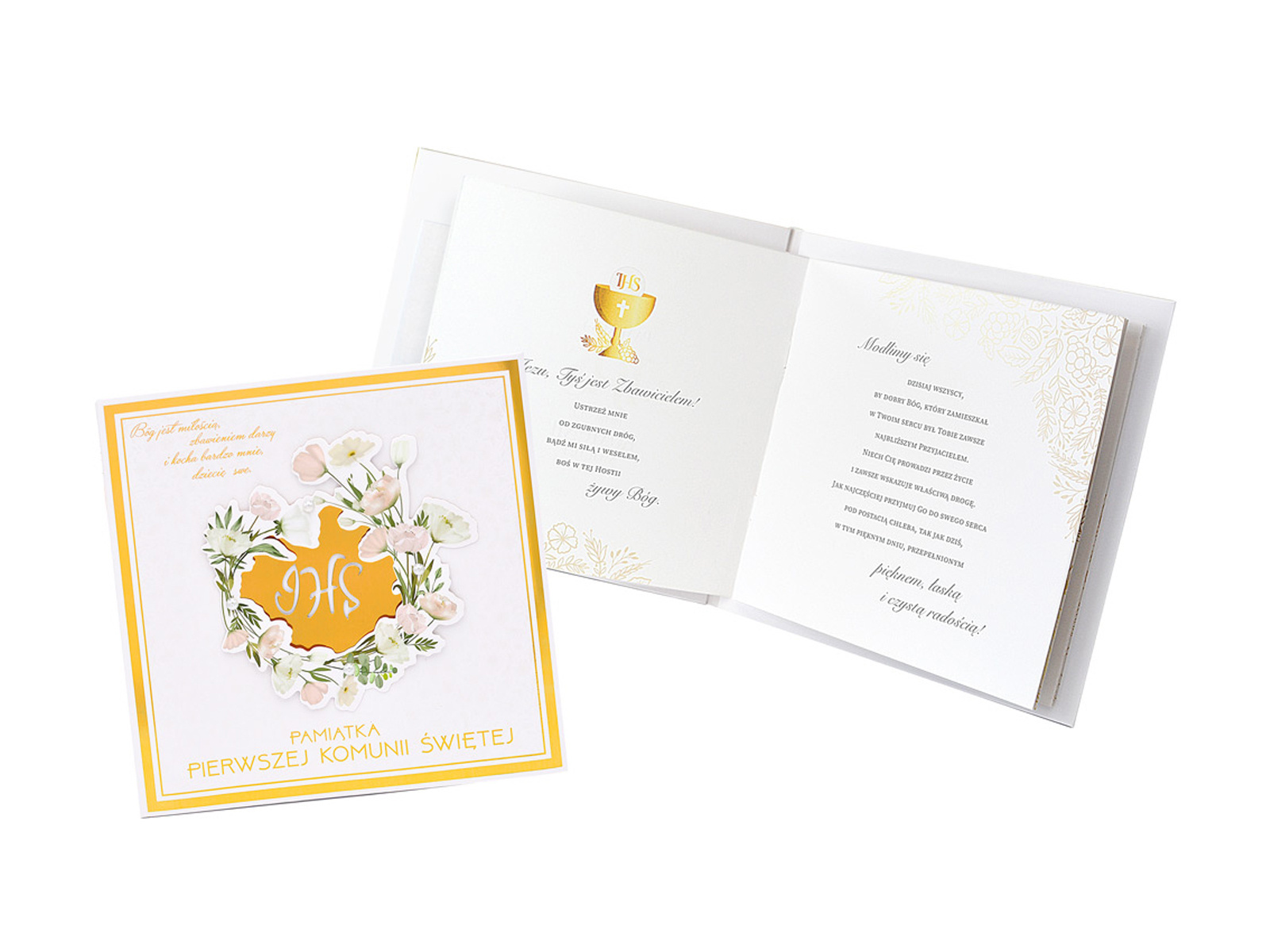 Kwadratowa kartka okolicznościowa z nadrukiem kwiatów i napisem Pamiątka Pierwszej Komunii Świętej.Karnet jest bogato zdobiony.Wewnątrz karnetu mieszczą się życzenia.W komplecie znajduje się biała koperta.Idealny dodatek do prezentu komunijnego. číst celé