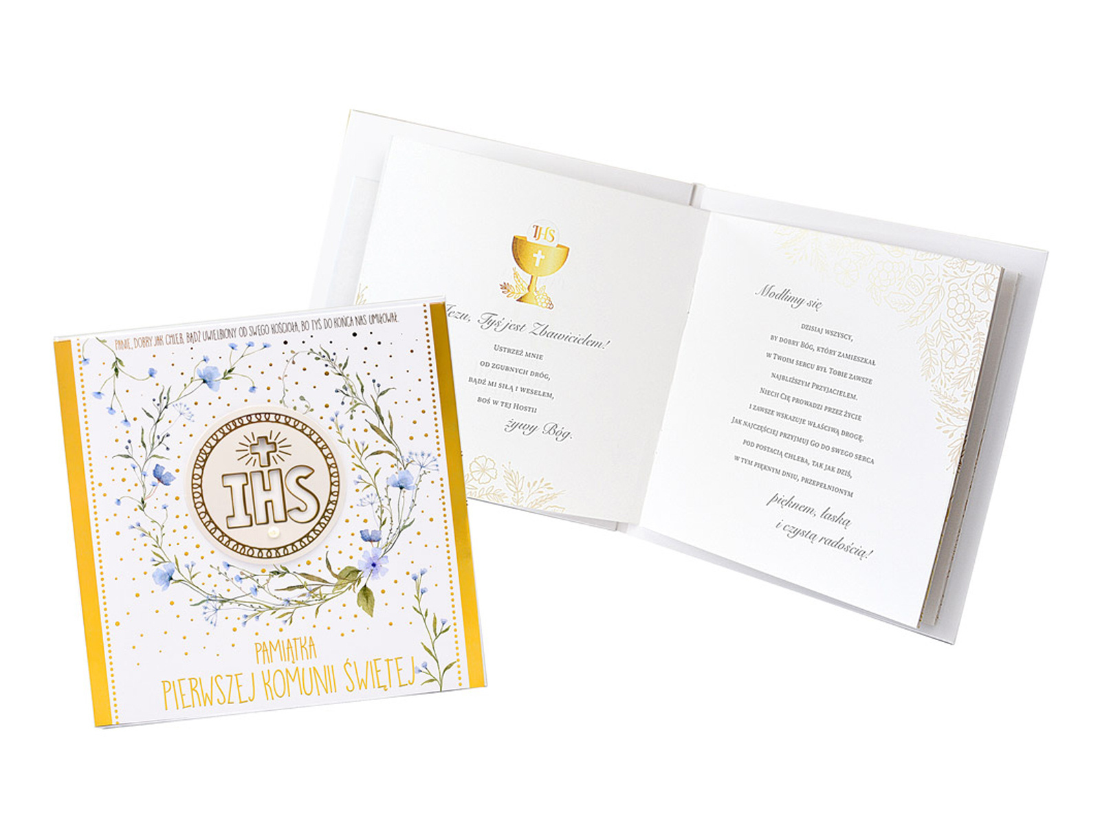 Kwadratowa kartka okolicznościowa z nadrukiem kwiatów i napisem Pamiątka Pierwszej Komunii Świętej.Karnet jest bogato zdobiony.Wewnątrz karnetu mieszczą się życzenia.Idealny dodatek do prezentu komunijnego.