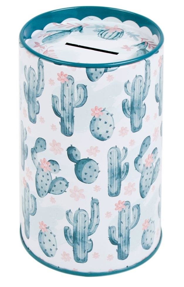 Metalowa skarbonka w kształcie tuby zdobiona grafiką w kaktusy. číst celé