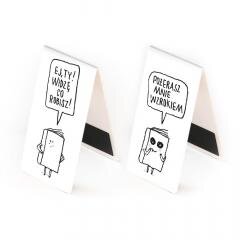 Lubisz przyglądać się książkom? Pożerasz je wzrokiem? ;) To zakładka dla Ciebie! Zaokrąglone rogi, papier kreda 350 g, folia zabezpieczająca błysk, folia magnetyczna na kawałku zakładki