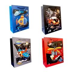 Torebka papierowa dziecięca, dla chłopca wykonana z grubszego papieru o gramaturze 210 g, co zapewnia jej większą trwałość i odporność na obciążenie. Wyposażona w grubszy, kolorowy sznurek, który zapewnia wygodny uchwyt i estetyczne wykończenie. To praktyczne opakowanie, które podkreśla wartość wręczanego prezentu.