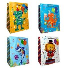 Torebka papierowa dziecięca z wizerunkiem zabawnych postaci wykonana z grubszego papieru o gramaturze 210 g, co zapewnia jej większą trwałość i odporność na obciążenie. Wyposażona w grubszy, kolorowy sznurek, który zapewnia wygodny uchwyt i estetyczne wykończenie. To praktyczne opakowanie, które podkreśla wartość wręczanego prezentu. Torebka posiada elementy brokatowe.