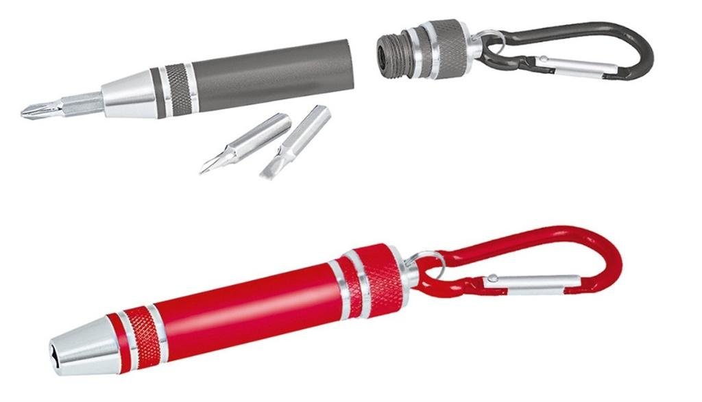 Śrubokręt, Breloczek Karabińczyk z kolekcji Expedition Natur. Breloczek - śrubokręt, niezbędny podczas każdej wycieczki. To cały zestaw narzędzi, który dzięki karabińczykowi można łatwo przymocować do plecaka, paska lub pęku kluczy. 3 bity w jednym narzędziu (2 x krzyżakowy, 1 x płaski). Szybka wymiana dzięki praktycznemu magnesowi. Bity można łatwo schować w uchwycie narzędzia. Wykonane ze stali nierdzewnej i aluminium.