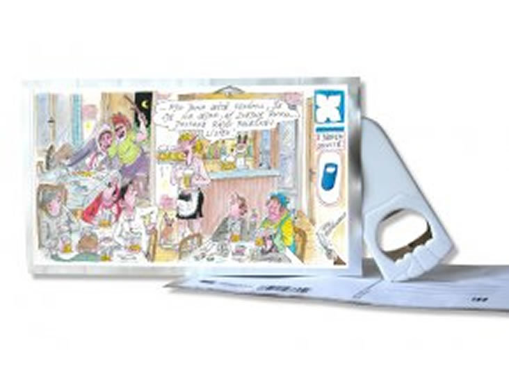 Pohlednice ve tvaru obálky z tvrdého papíru s dárkem uvnitř. Rozměry: 18,5x11 cm. Obsah: otvírák