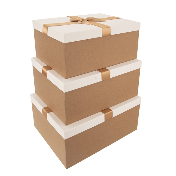 Krabice s víkem. Sada 3 ks. Se stuhou. Materiál: papír. Rozměry: 29x19x12 cm, 31x21x13 cm, 33x23x14 cm.