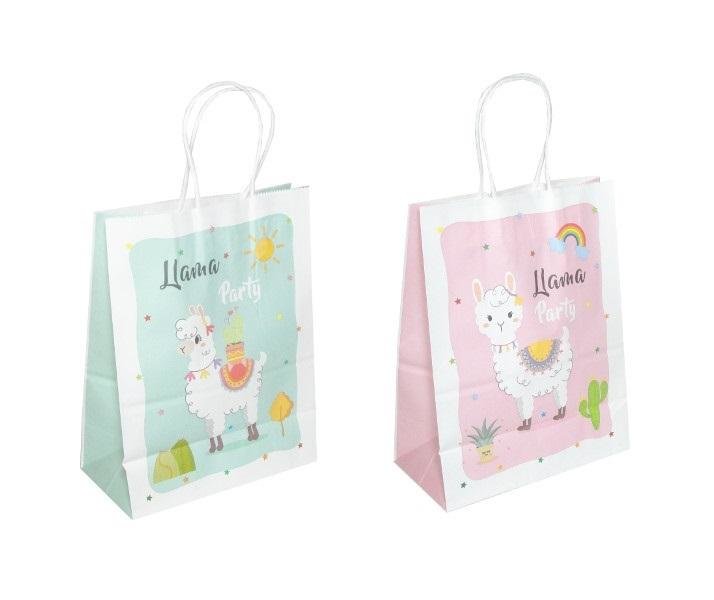 Papierowa torebka na prezenty z lamą. Produkt występuje w kilku wersjach, wybierany losowo. Cena dotyczy jednej sztuki.