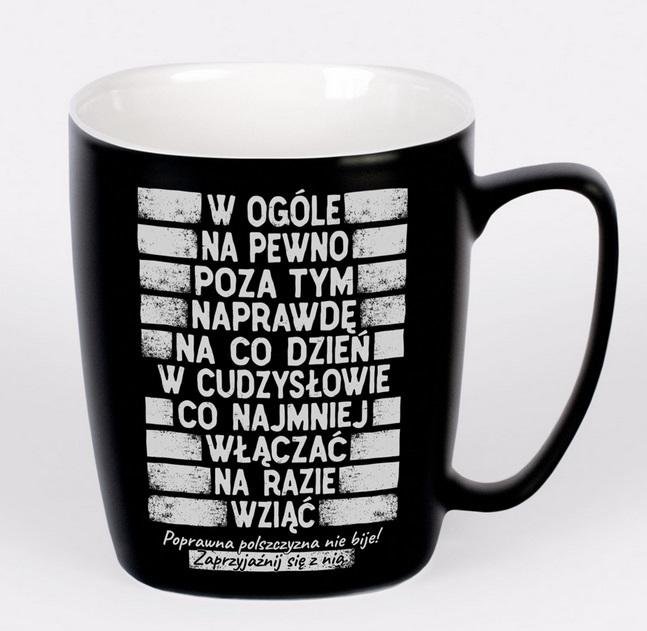 Kubek matowy PARSZYWA 10 poleca się na prezent dla miłośnika polszczyzny, mistrza ortografii, językoznawcy, a także każdej osoby, która chciałaby już nigdy nie mieć wątpliwości, jaka jest poprawna pisownia "na razie", "na co dzień", "poszedłem", "wziąć", "poza tym", "w ogóle", "co najmniej".