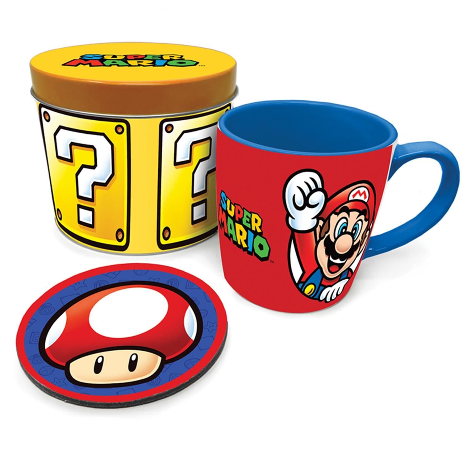 - Obsah sady: keramický hrnek s motivem Super Maria, korkový podtácek, plechová dárková krabička