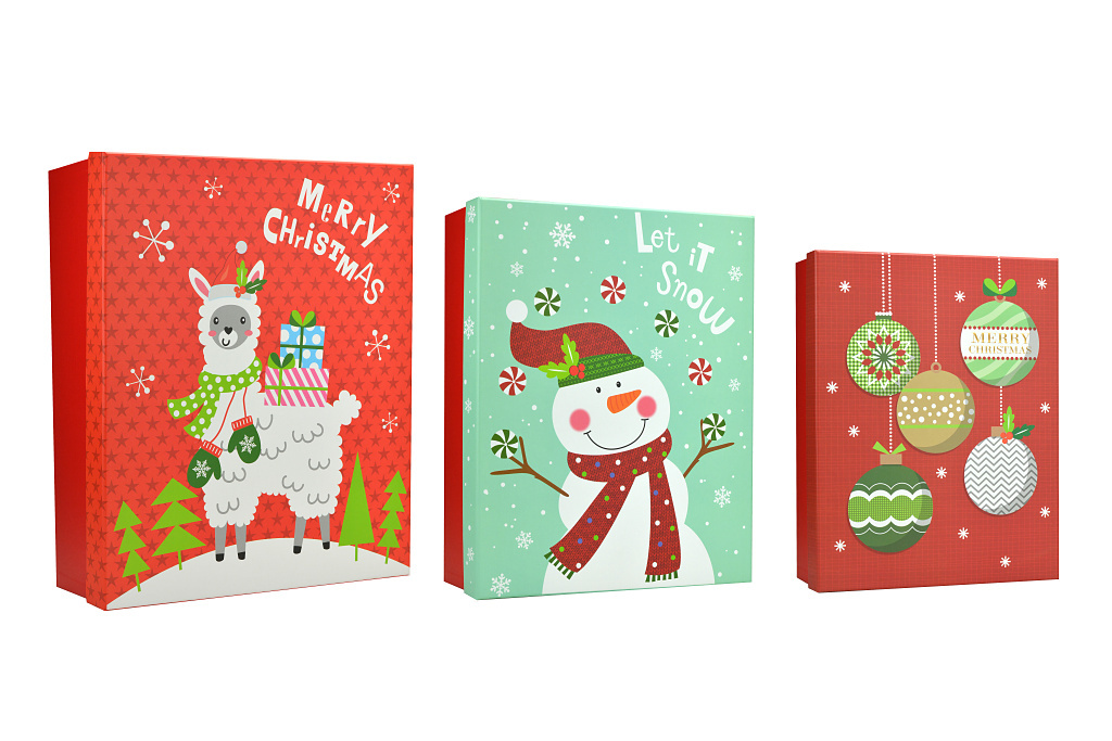 Odlište se od ostatních a darujte letos dětem dárky v krásném balení. Sada 3 ks dárkových krabic z tvrdého papíru s víkem. Krabice jsou kvalitně do detailu zpracované, hezky barevné. Uvnitř mají bílou barvu. Přibližné rozměry krabic: 35,5 x 29 x 10,5 cm 33,5 x 26,5 x 9,5 cm 30,5 x 24 x 8,5 cm