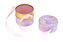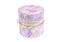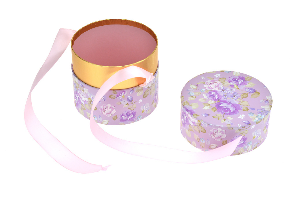 Kulatá dárková krabička s motivy květin ve fialové barvě se zlatým lemováním a stuhou. Krabička je vhodná pro drobné dárky.