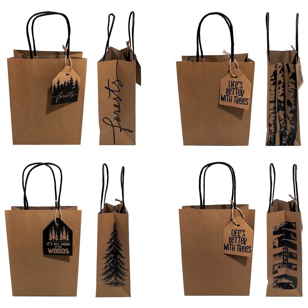 Torebka S FOREST z papieru kraft z elegancką przywieszką, rączki ze skręconego czarnego papieru, mix wzorów wysyłany losowo.