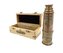 Dalekohled je zabalen v dřevěné krabici, která vypadá jako truhla s pokladem.