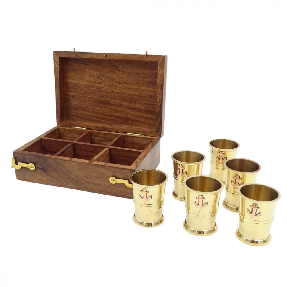 Sada 6ti kovových panáků o objemu 50ml, ve zlaté barvě, zdobených kotvou a uložených v dekorativní dřevěné krabičce. Panáky se budou skvěle hodit jak na domácí párty, tak na venkovní akce. Jsou vyrobeny z mosazi a jsou odolné proti rozbití.