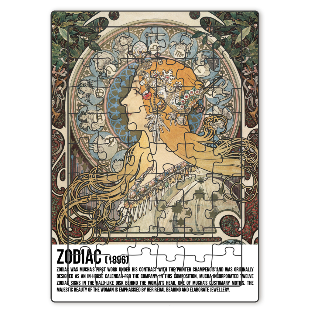 Puzzle ve formátu A4 s obrazem Zodiac malíře Alfonse Muchy. Puzzle obsahuje 54 dílků. číst celé