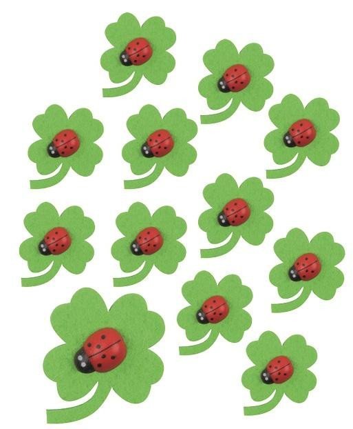 Čtyřlístky filcové s beruškou s lepíkem 3 cm, 12ks v sáčku