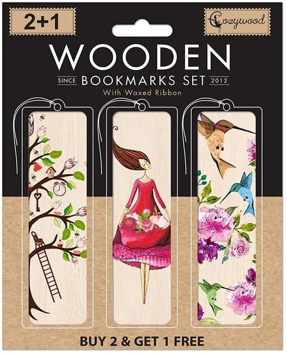 Zestaw 3 drewnianych zakładek ze wstążką i obustronnym nadrukiem. Są w 100% biodegradowalne, wykonane przy użyciu minimalnego nakładu energii, gazu i wody. Wyprodukowane na Litwie.